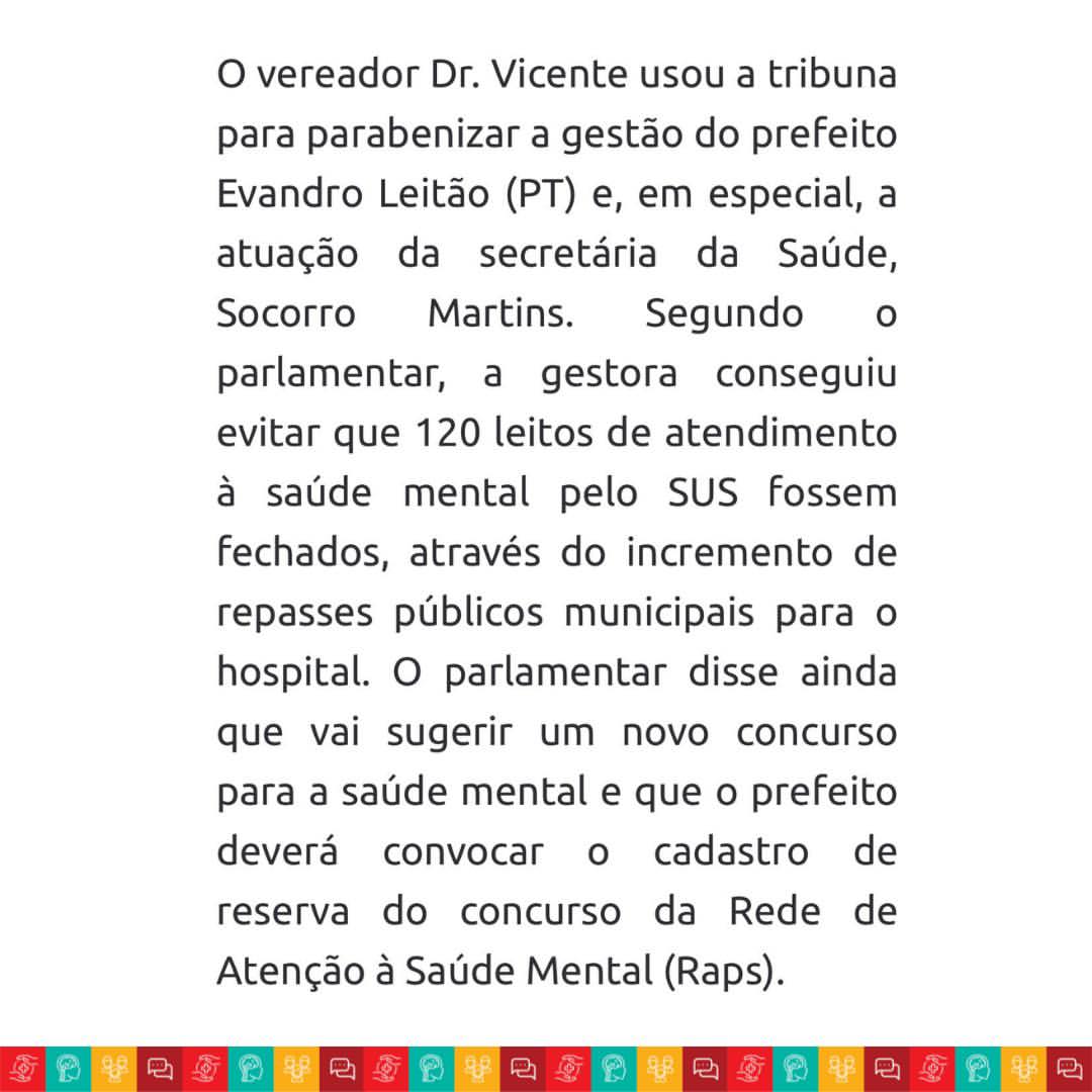 Falei no dia 24 de abril de 2025, na tribuna da Câmara sobre a importância da decisão da gestão do prefeito Evandro Leitão e da secretária Socorro Martins de manter os 120 leitos de saúde mental no SUS, garantindo repasses municipais fundamentais para o hospital.